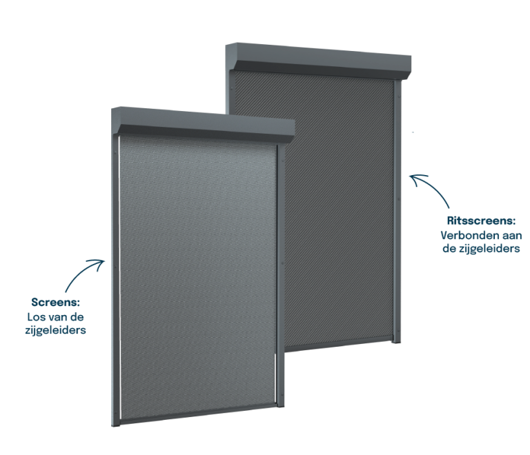 Het verschil tussen een ritsscreen, ook wel zipscreens of windvaste screens genoemd, zit in de geleiders. Bij ritsscreens is het doek verbonden aan de zijgeleiders. Dit zorgt ervoor dat het doek niet klappert, steviger is, en er geen lichtinval door kieren ontstaat.
